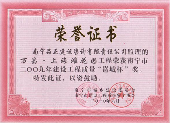 2010年6月,南寧品正負責監(jiān)理的南寧市南站南側路工程C標、E標、南寧市江南堤路園項目市政工程道路施工1#標、南寧市精品線路綜合整治工程(一期)B標、南寧市五象廣場周邊區(qū)域市政設施綜合整治工程I標工程、南寧市五象廣場周邊區(qū)域市政設施綜合整治工程I標、南梧大道工程(高速環(huán)二塘收費站到三塘下丹橋)NO.7標段、萬昌·上海灘花園工程、廣西明陽工業(yè)園啟動區(qū)道路工程III標等多個工程分別榮獲南寧市城鄉(xiāng)建設委員會、南寧市建設工程質量安全協(xié)會頒發(fā)的南寧市2009年建設工程質量“邕城杯”獎。